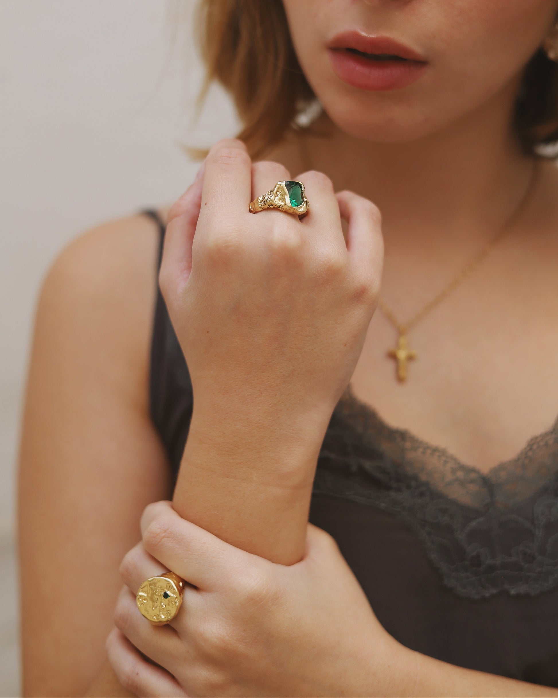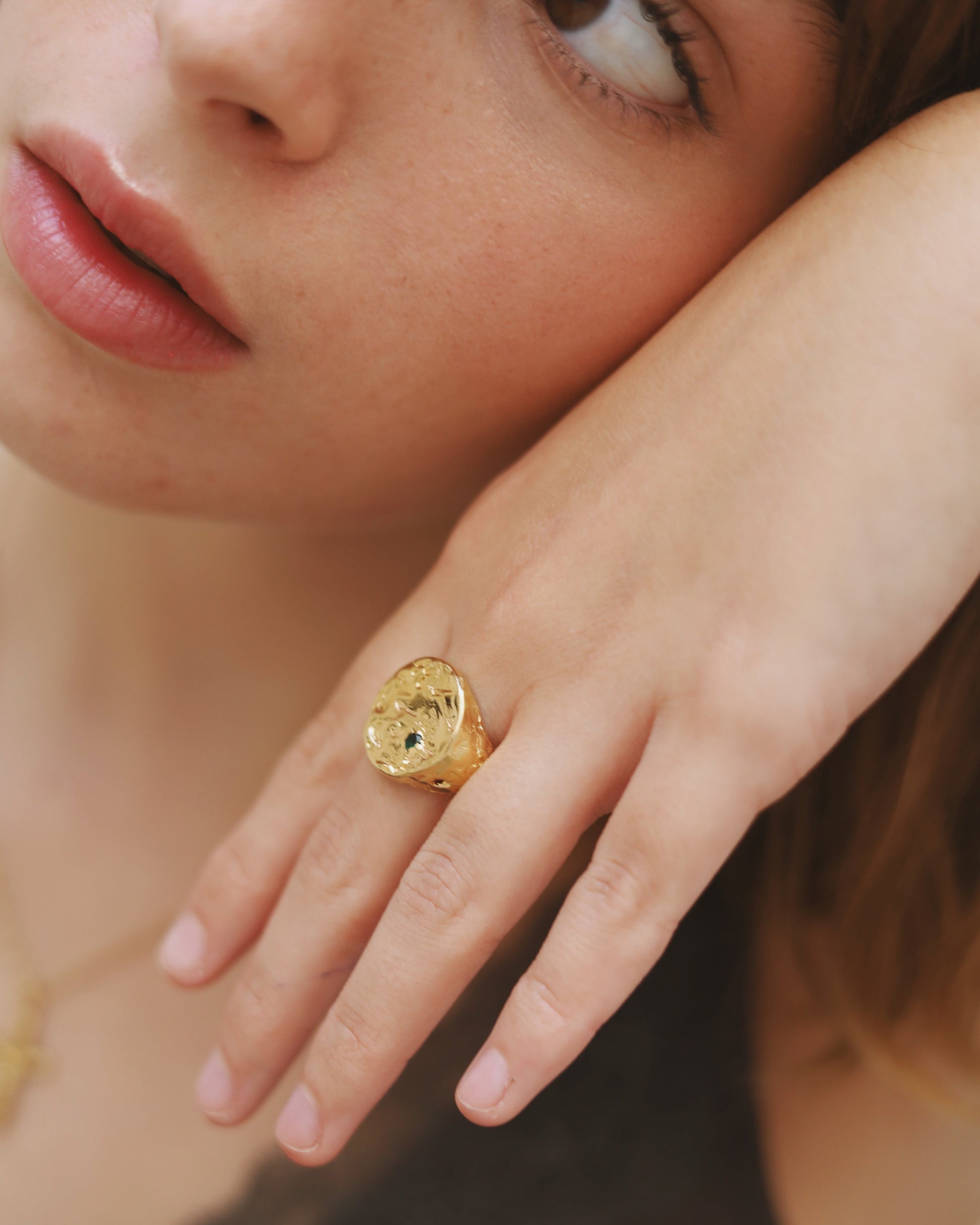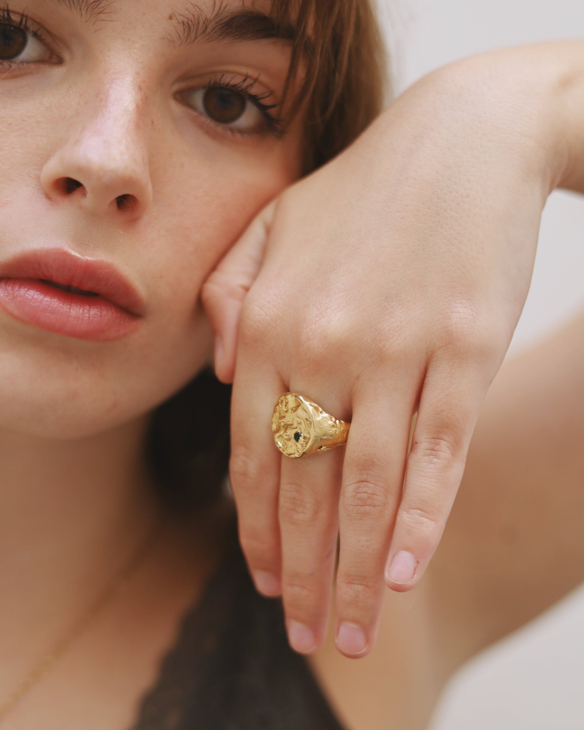 The round signet ring Ladera is one of our icons since we started the brand. Inspired by the hillsides, its precious Emerald and the organic shape and texture, characteristic of Apreels, makes it a perfect piece of genderless jewelry for any occasion.